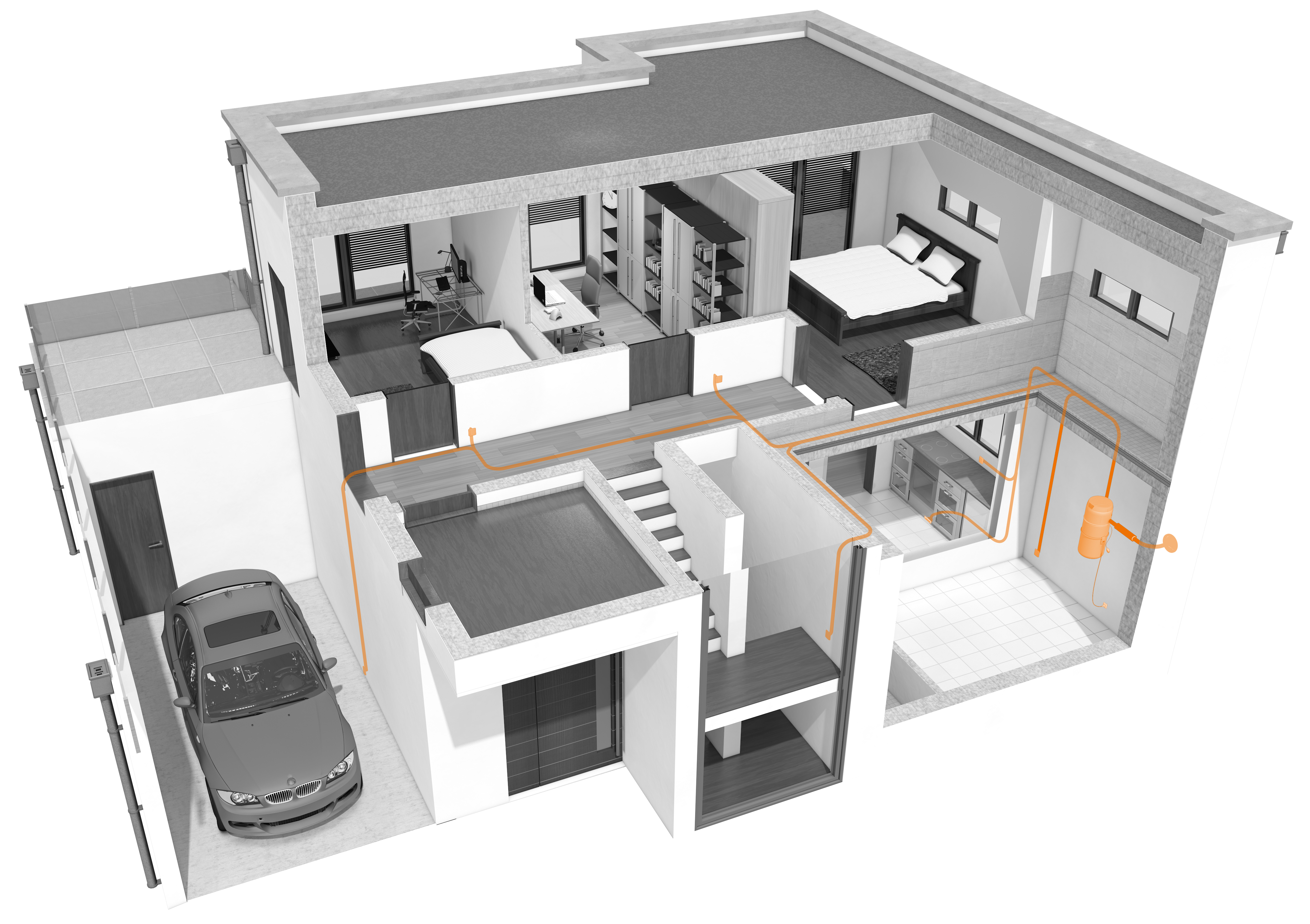 Zentralgerät: Das Zentralgerät stellt das „Herz“ Ihrer Anlage dar. Die Montage kann in einem Nebenraum wie Garage, Hauswirtschaftsraum oder im Keller erfolgen.